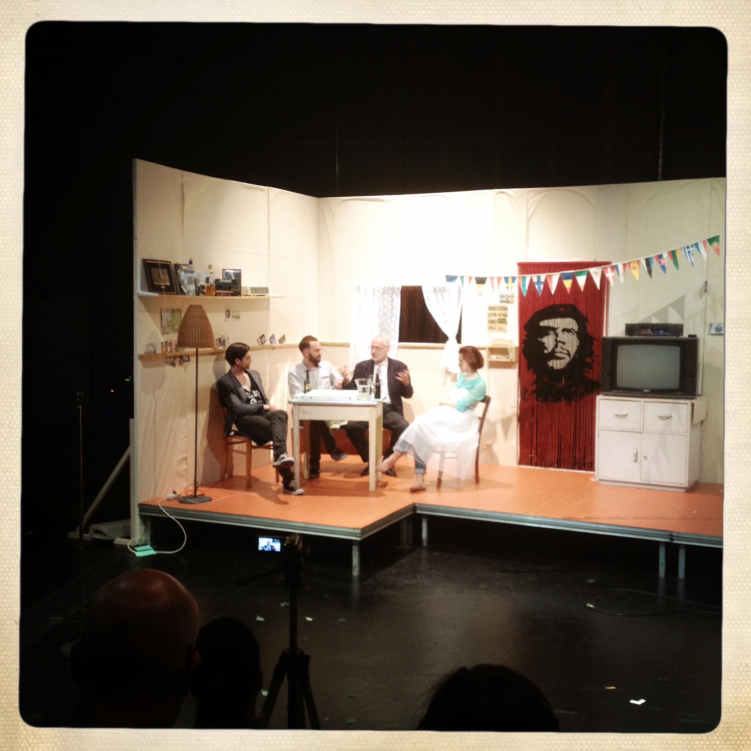 Hocherfreulich, dass „Goodbye Europe!“ mit dieser Umbruchphase gleichermaßen intelligent als auch spielerisch umging. Zu erleben war ein quirliges Dokumentartheater, das kluge Fragen stellte – und sich gleichzeitig davor hütete, in tumbe Ostalgie zu verfallen. Zwischen 1989 und ergo der Implosion des Ostblocks bis zu den aktuellen Identitäts- und Wirtschaftskrisen in der Europäischen Union wird der Handlungs- und Reflektionsbogen gespannt, die drei Darsteller Jakob Beubler, Boris Popovic und Christina Scherrer sezieren mit Aplomb und Verkleidungsfuror den Umbruch von 1989 und dessen Folgen. Mittels  ARD-Tagesschauen aus jenen historischen Tagen wurden Erinnerungen wachgerufen, schließlich aus der Kühltruhe der Neo-Klassiker Heiner Müller hervorgeholt.